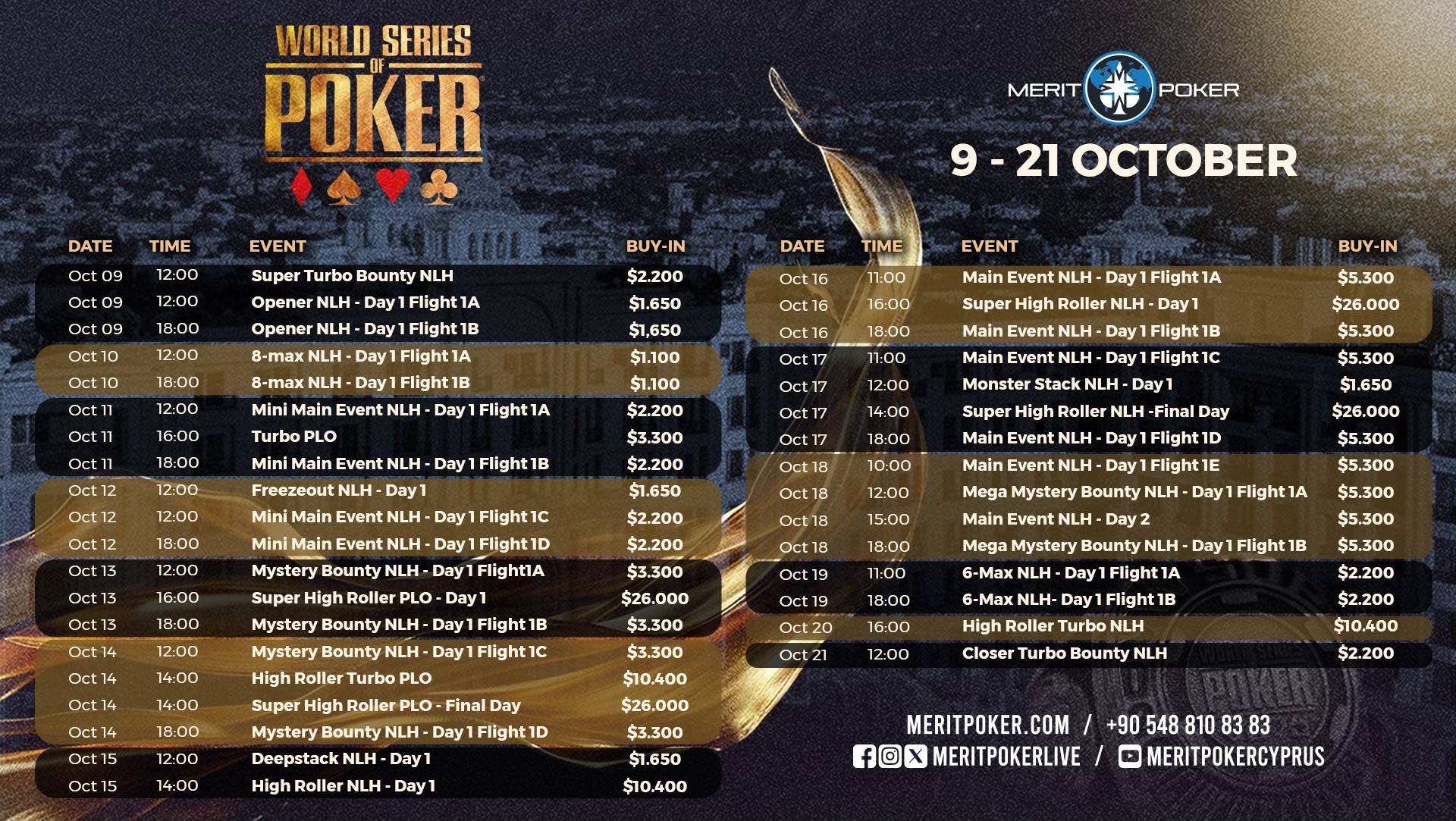 Erstmals gibt es einen WSOP Super Circuit im Merit Royal Diamond auf Zypern. 18 Ring Events warten gleich im Anschluss an die WSOP Europe im King’s. Anders als man es vom Merit gewohnt ist, gibt es hier kaum Preisgeldgarantien, aber das $5.300 Main Event kommt mit $5.000.000 GTD. Ansonsten liegen die Buy-Ins hier zwischen $1.100 und $26.000, neben überwiegend NLH Turnieren gibt es auch das ein oder andere PLO Turnier.