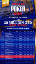 Das King’s Resort Rozvadov ist auch dieses Jahr Schauplatz der WSOP Europe. Satte € 20.000.000 an Preisgeldern warten ebenso wie 15 Bracelets. Das € 10.350 Main Event kommt dieses Jahr mit einer € 6.000.000 Garantie, aber auch die anderen Events können sich sehen lassen. Die Buy-In Range geht von € 350 beim King’s Million (€ 1.000.000 GTD) bis € 25.000 beim GGMillion$ (€ 1.000.000 GTD). Zahlreiche Satellites nicht nur für das Main Event, sondern auch für die anderen Bracelet Events werden angeboten.