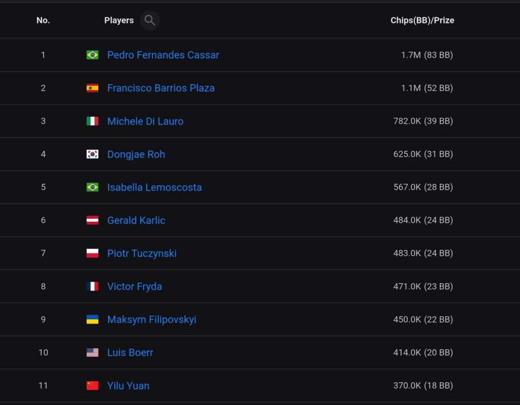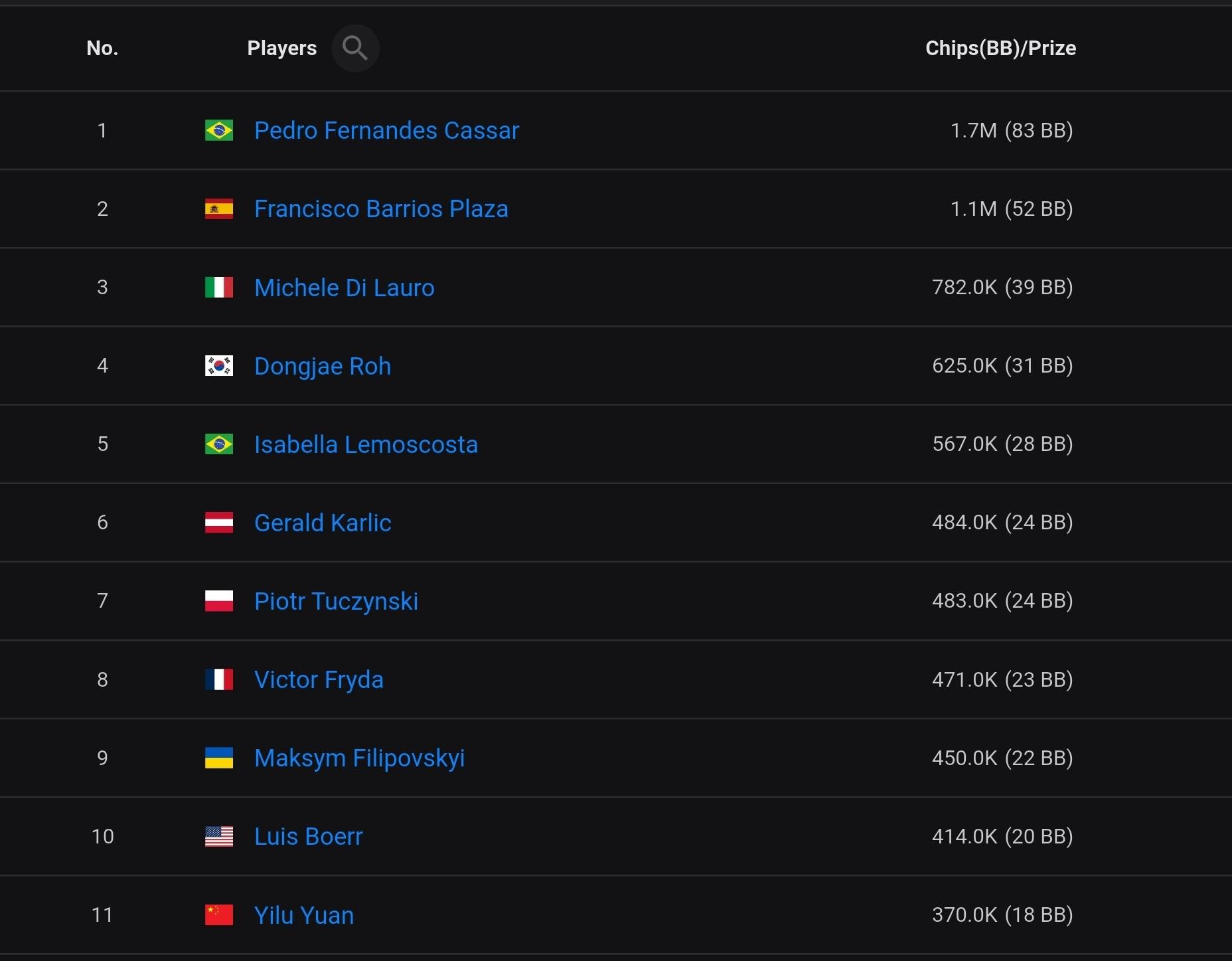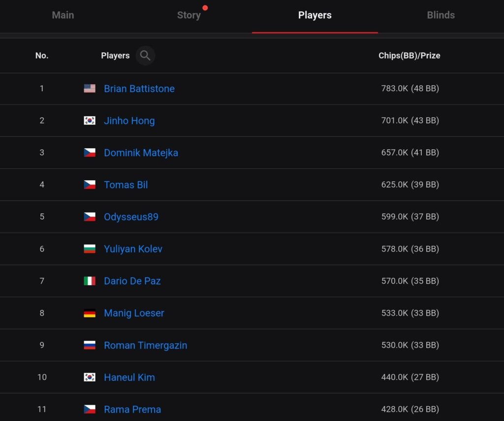 Brian Battistone sicherte sich mit 783.000 Chips Tag 1A, Manig Loeser sorgte mit 533.000 Chips für die beste deutsche Platzierung. An Tag 1B stürmte dann der Brasilianer Pedro Fernandes Caesar mit 1.700.000 chips an die Spitze, Hier präsentierte sich Gerald Karlic wieder in Topform und tütete 484k ein.  Allzu viele DACHs haben es nicht ins Geld bzw.in Tag 2 geschafft.