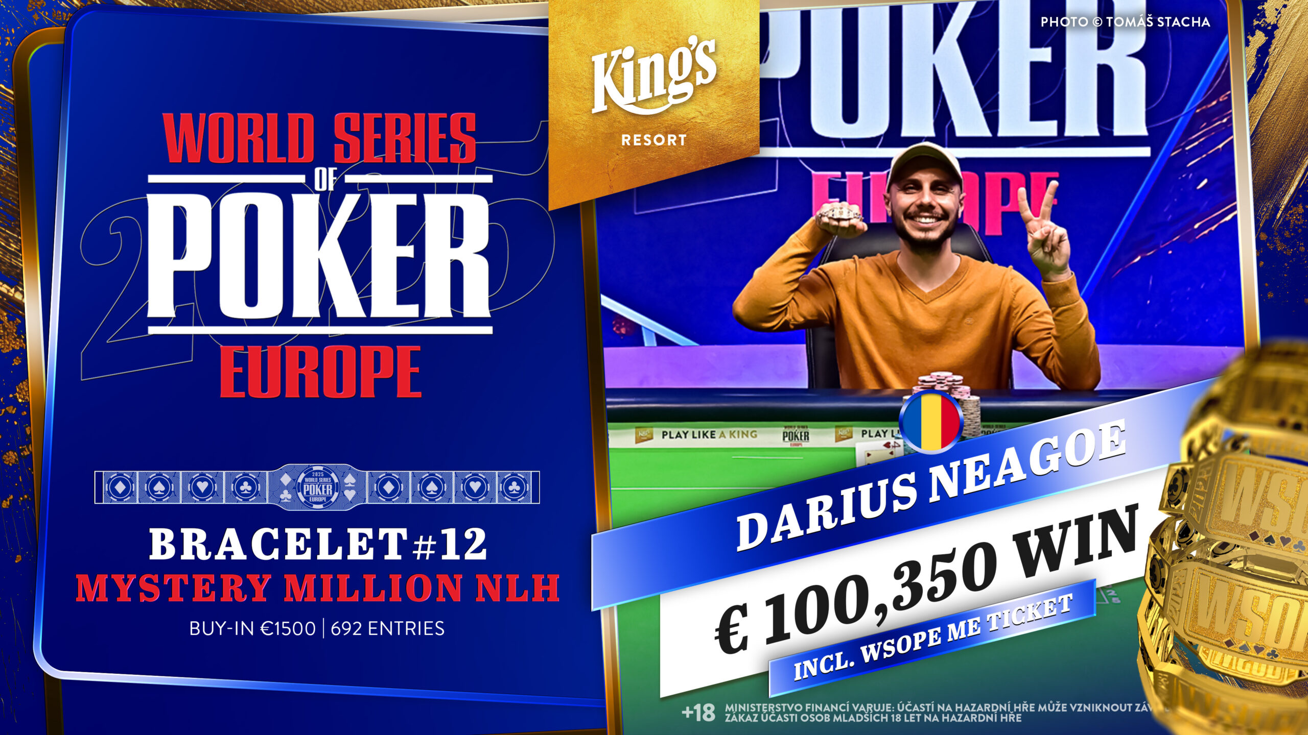 Kein Bracelet für Deutschland. Darius Neagoe schnappte Rene Schnitzler und Matthias Gude das begehrte Armband beim € 1.000 + 500 Mystery Millions Event # 12 (€ 1.000.000 GTD inkl. 10 x € 10.350 WSOPE ME Tickets) der World Series of Poker (WSOP) Europe 2025 im King’s Resort Rozvadov weg und jubelte über € 90.000 + € 10.350 WSOPE Main Event Ticket (und Bounties).