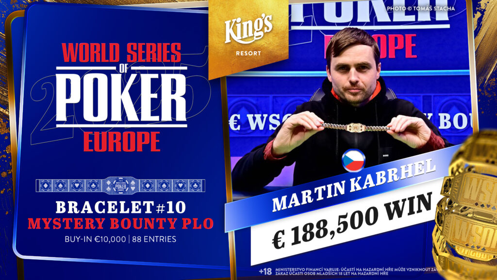 Bracelet # 5 für Martin Kabrhel. Der tschechische Pro hat sich beim € 7.500 + 2.500 PLO Mystery Bounty Event # 10 (€ 1.000.000 GTD) der World Series of Poker (WSOP) Europe 2025 im King’s Resort Rozvadov gestern, den 30. September, im hochkarätigen Feld durchgesetzt und den Sieg für € 188.500 + € 62.500 an Bounties geholt.