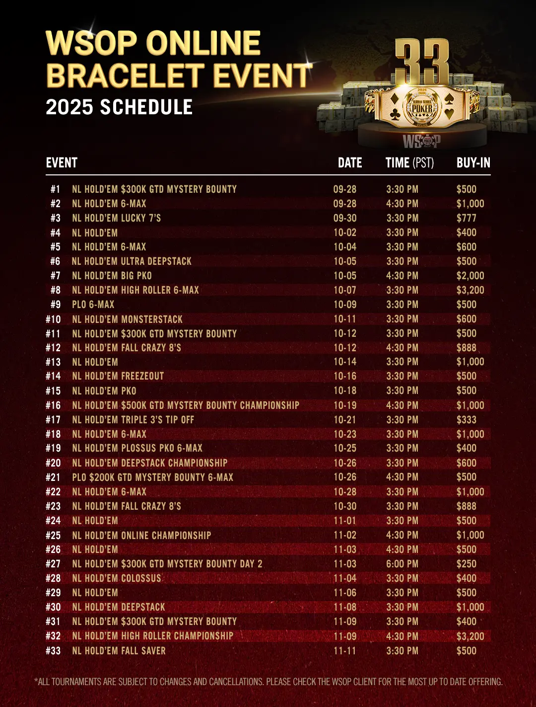 Vom 28. September bis 11. November wird auf WSOP.com die Online Gold Bracelet Series 2025 gespielt.