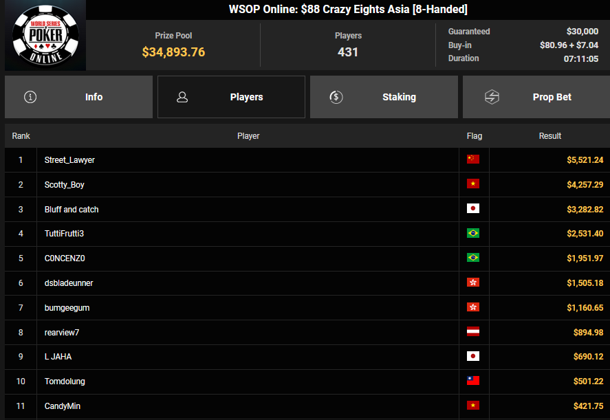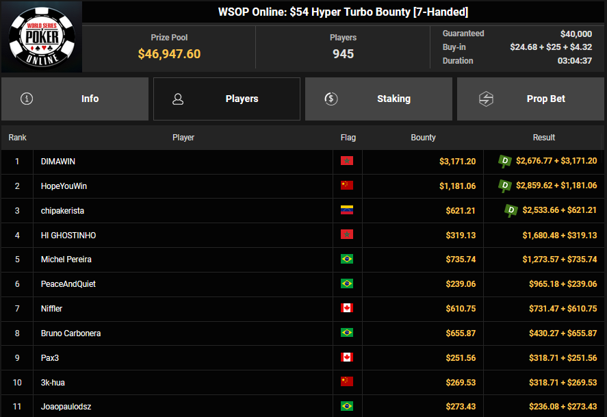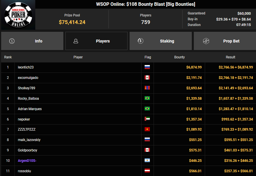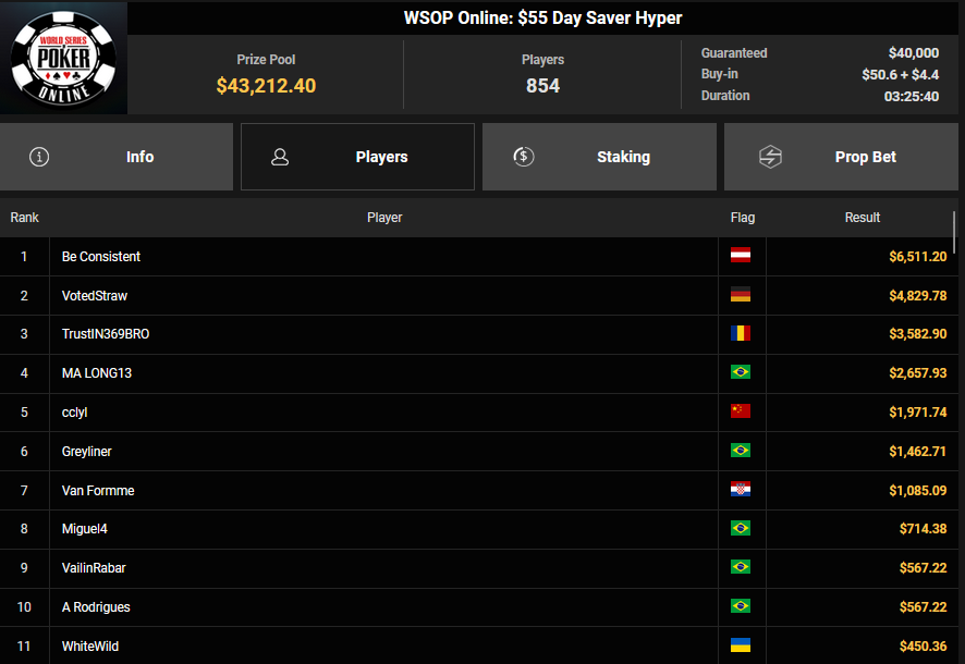 Bei den Side Events konnten die DACHs gestern noch ein wenig mitnehmen. So kassierte Puede Ser Hoy für Platz 3 beim $88 Bounty Classic $4.728 + $1.394, Savethedave1 wurde beim $44 Forty Stack Bounty Runner-up für $8.703 + $928. Cpt Olimar wurde Dritter beim $88 Crazy Eights, a2xxx verpasste beim gleich 8.408 Entries starken $54 Bounty Hunters Daily Deepstack das Podest und nahm $11.162 + $3.162 für Rang 4 mit.