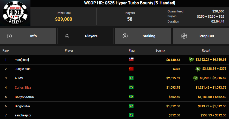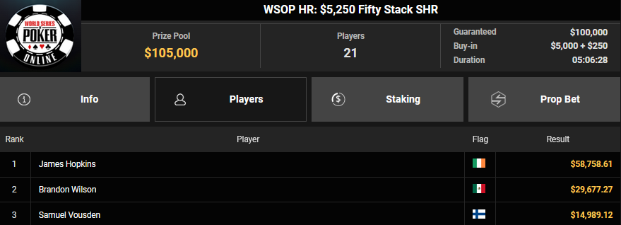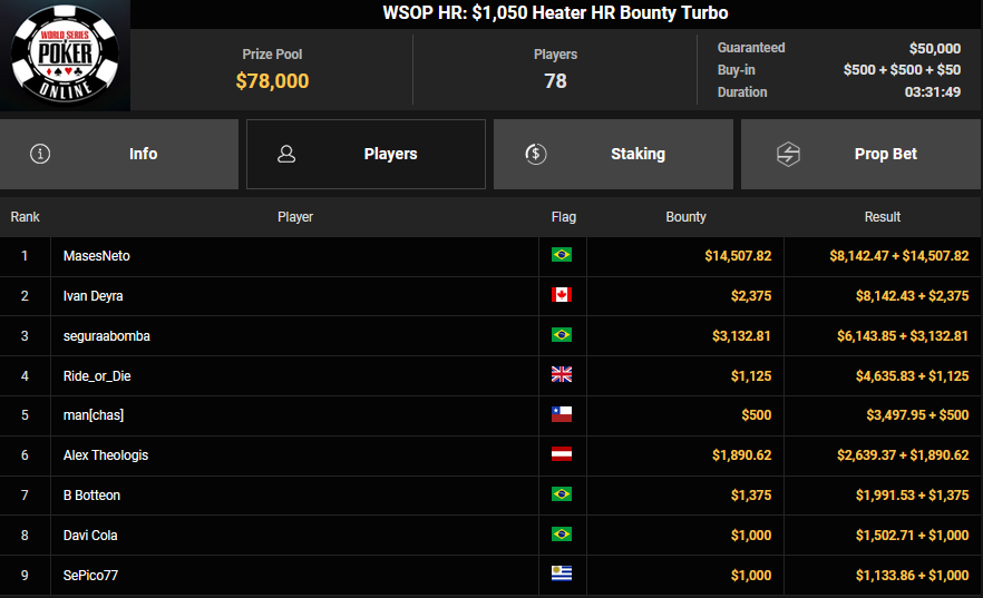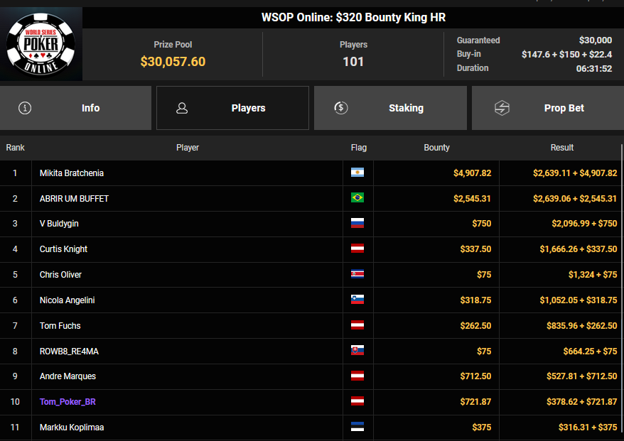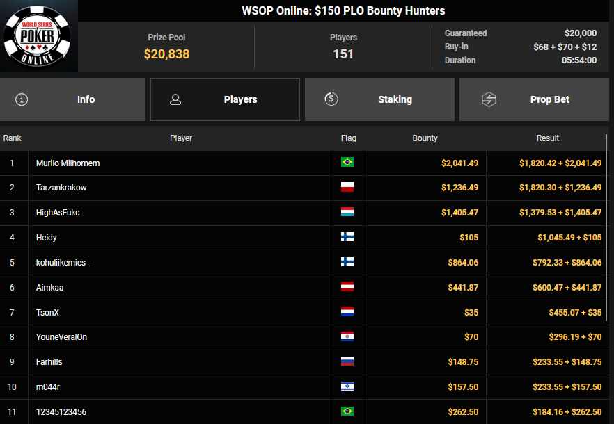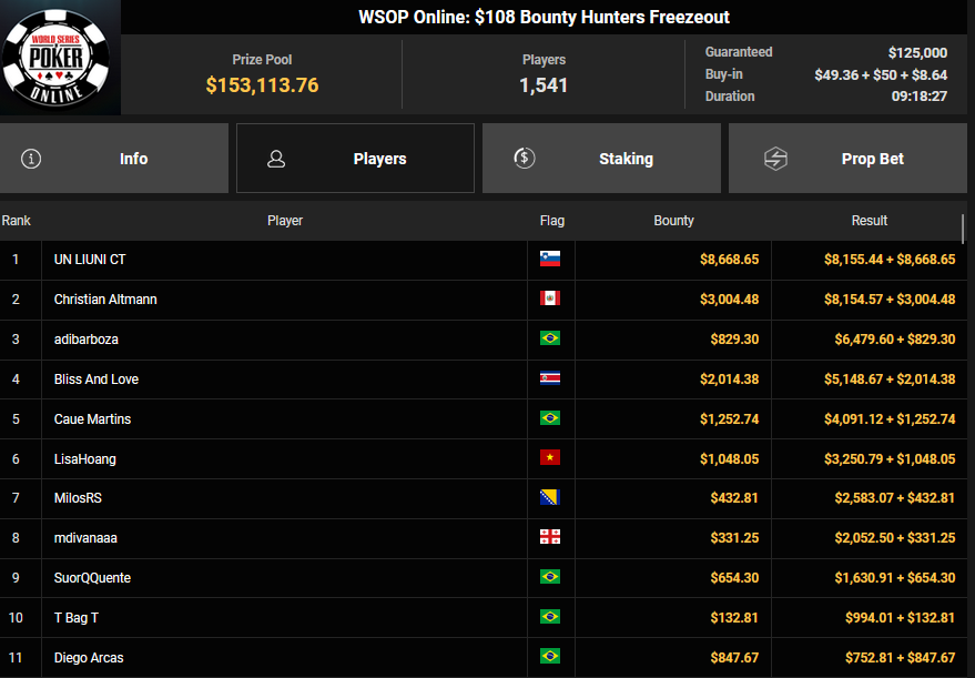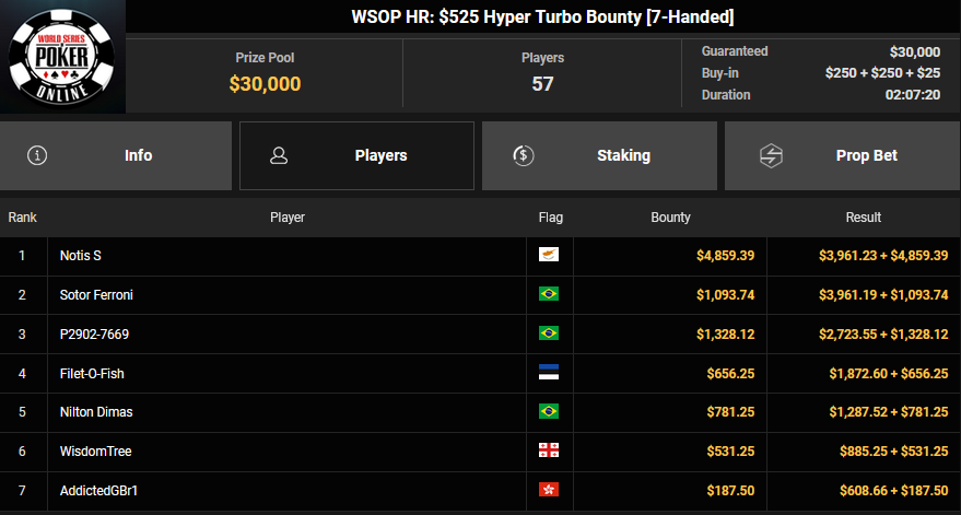 FlushUrTears siegte beim $525 Bounty Hutners HR. Mit 1.912 Entries blieb man hier nur knapp unter der Million, $50.081 + $50.757 gab es für den Sieg. Chris Nguyen kassierte für Rang 4 beim $5.250 Bounty Hunters SHR $16.977 + $11.015, Daniel Smiljkovic nahm für Rang 3 $24.606 + $16.601 mit. Für Smille gab es dann weitere $34.916, nachdem er beim $3.000 Prime Time mit Enrico Camosci teilte.