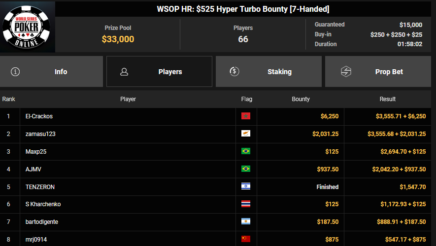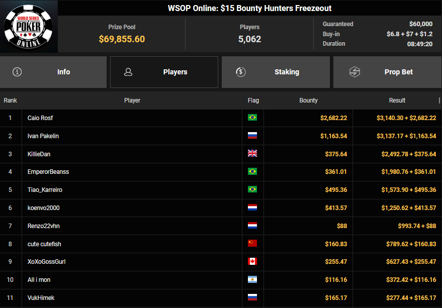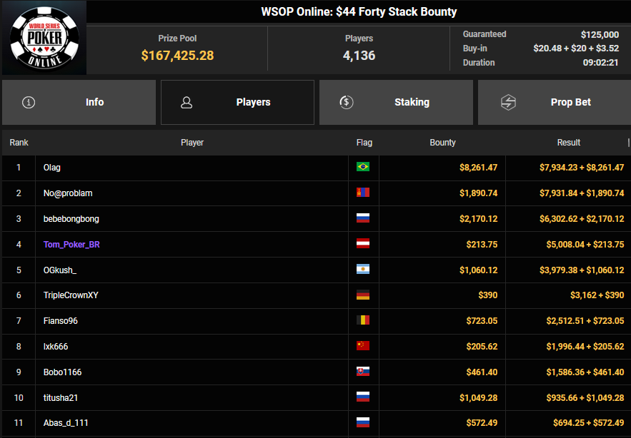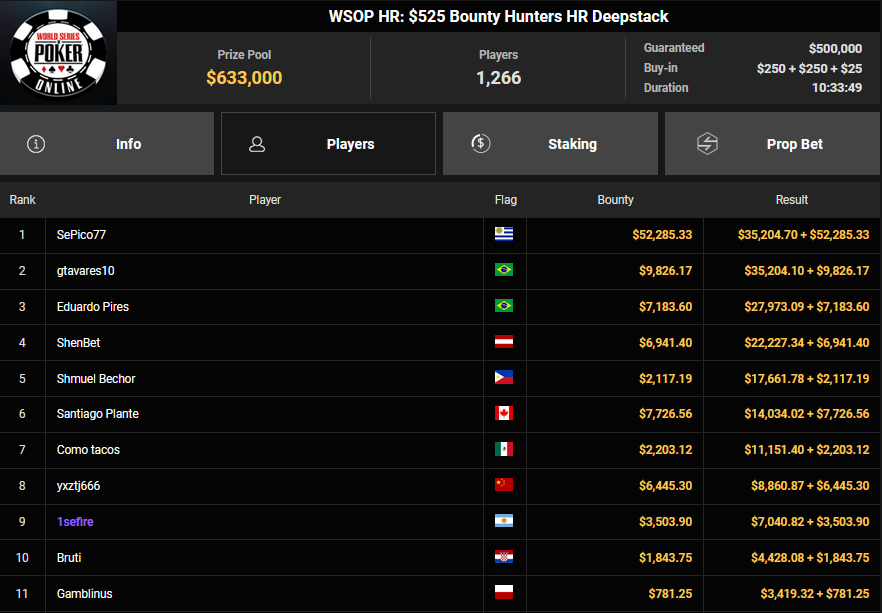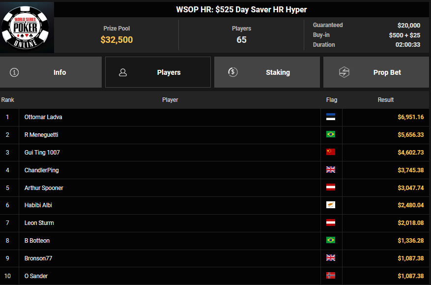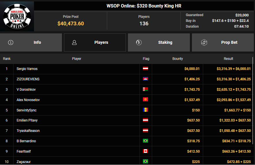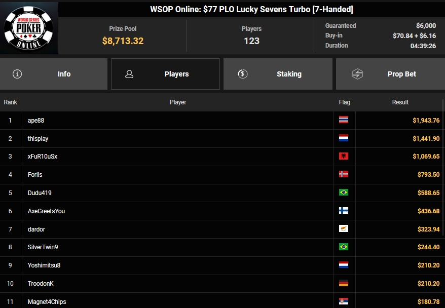 Bei den Side Events blieb die Erfolgsquote der DACHs gestern sehr überschaubar. 888520 holte den Sieg beim $15 Bounty Warm-up für $4.246 + $3.627, ProfaNic_v2 holte Rang 3 beim $88 Bounty Classic für $4.163 + $2.184. R@inMaker wurde beim $55 PLO Double Stack Runner-up für $1.829, rossoblu siegte beim $88 Crzay Eights ($9.487). Caspar Engelien kam beim $250 Daily Main Event auf Rang 3 für $12.441, dunarr wurde beim $150 PLO Bounty Hunters Runner-up für $1.820 + $960. BooYaH_ konnte für Rang 3 beim $77 Lucky Sevens Turbo noch $4.458 mitnehmen.