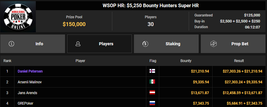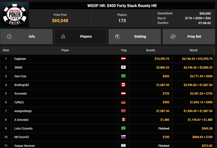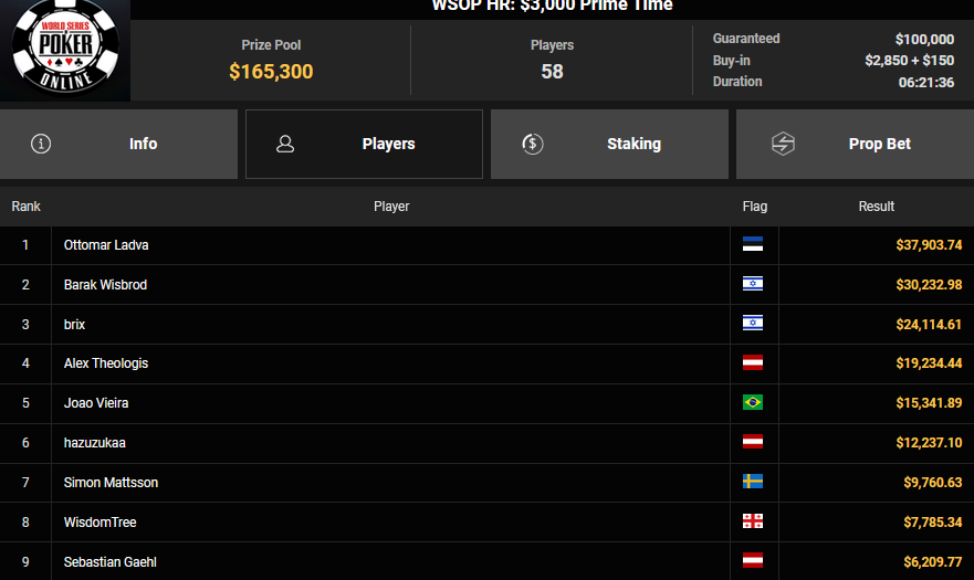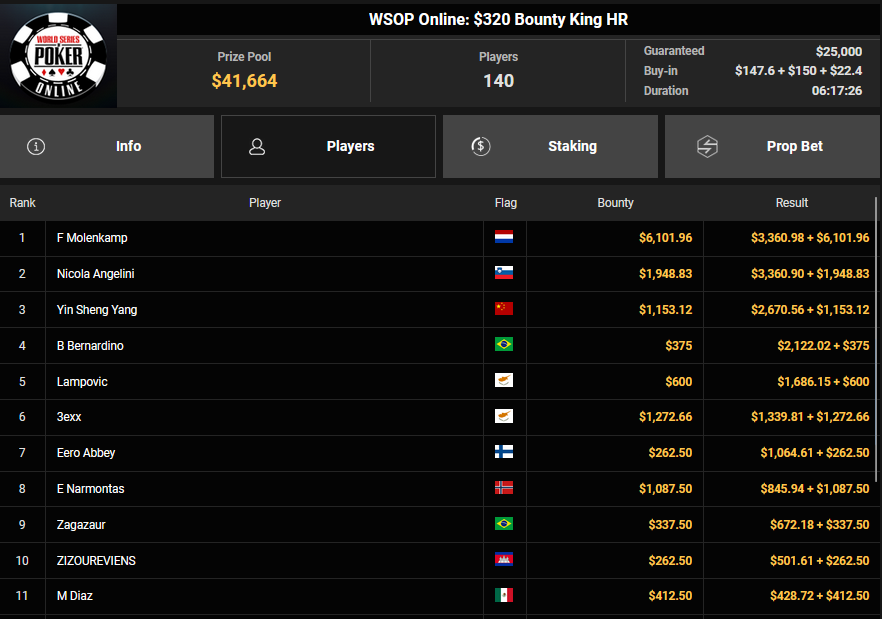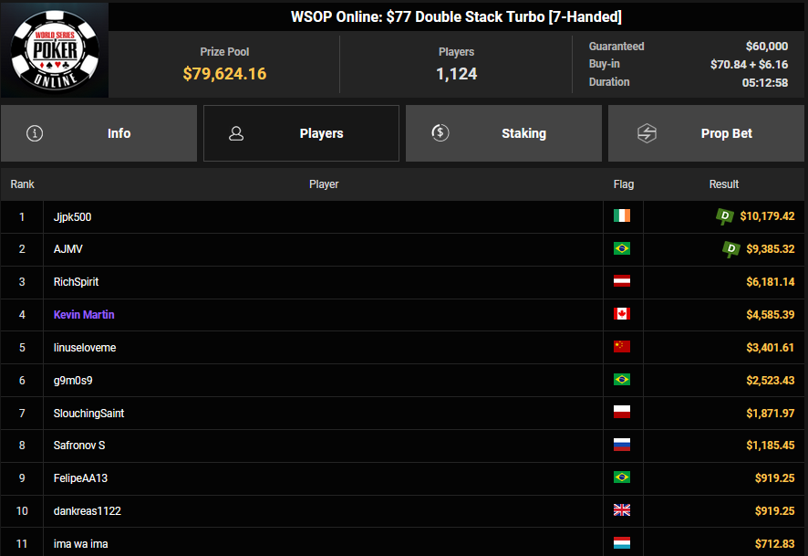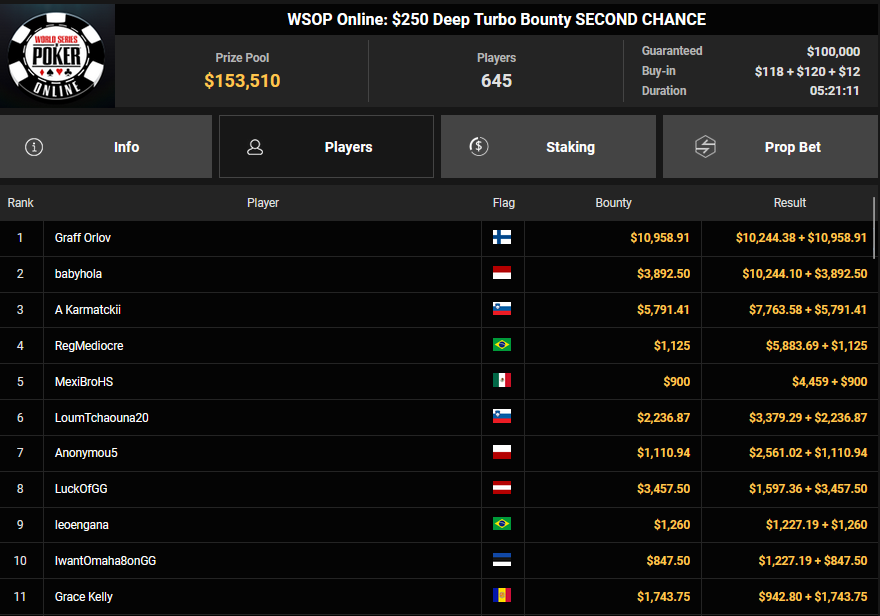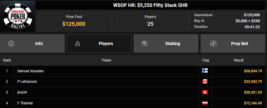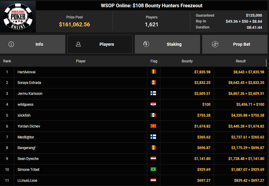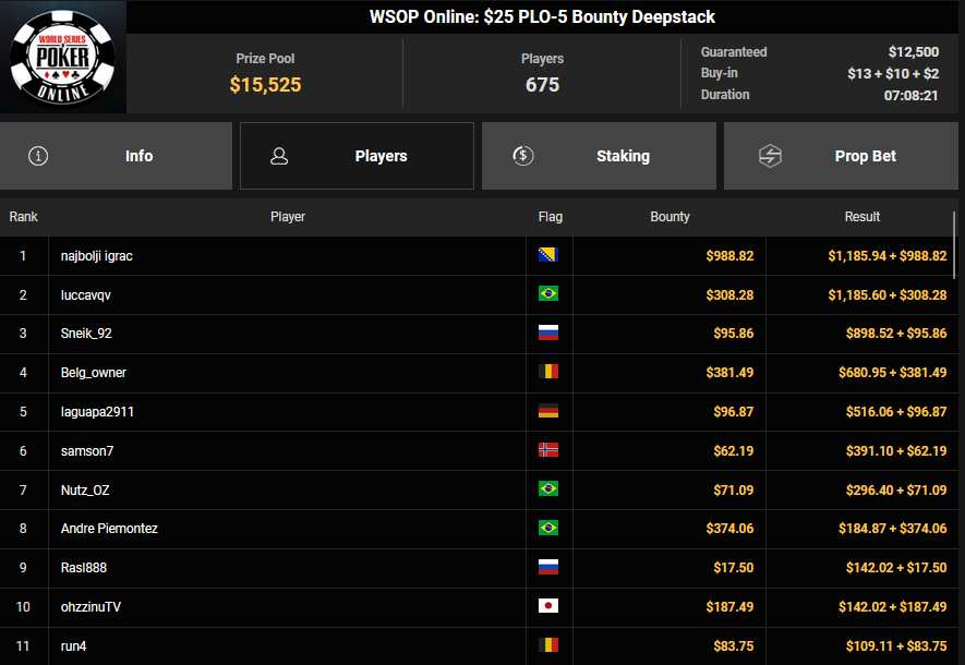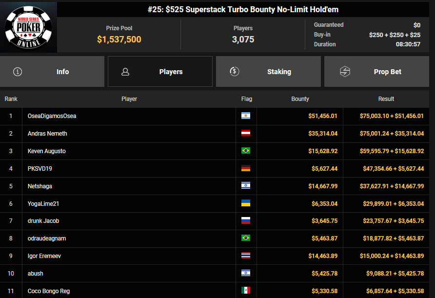 Auch das $525 Superstack Turbo (#18) war mit 3.075 Entries wieder stark frequentiert, $1.537.500 landeten im Pot. PSKVD19 kam als bester Deutscher auf Rang 4 und sicherte sich $47.354 + $5.627. Der Ungar Andras Nemeth unterlag im Heads-up OseaDigamosOsea, der sich das Bracelet für $75.003 + $51.456 + $30k WSOPP Super Pass sicherte.