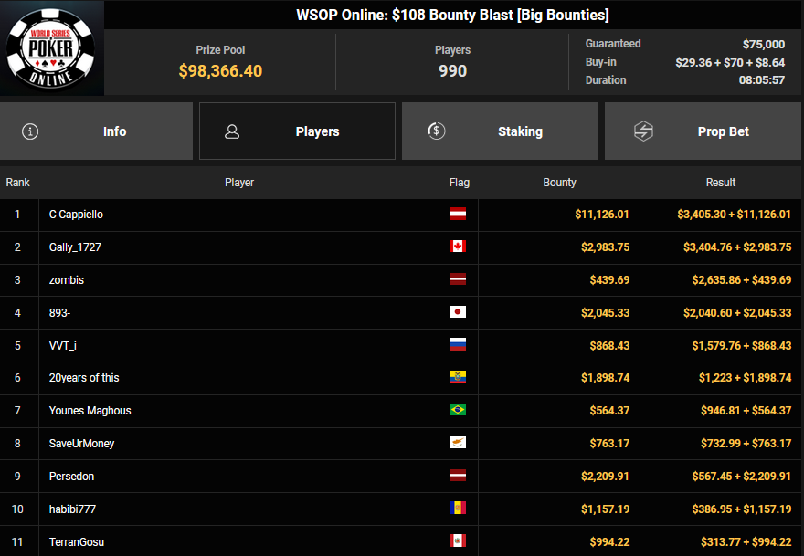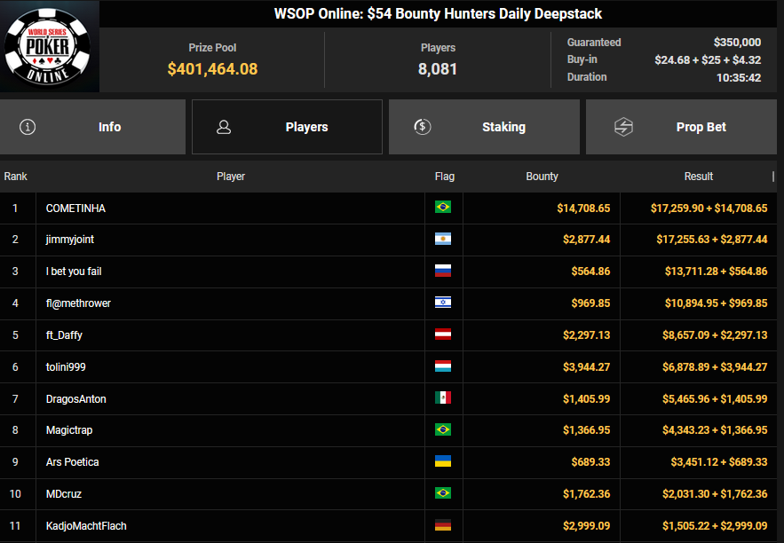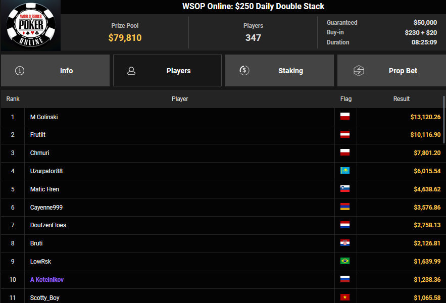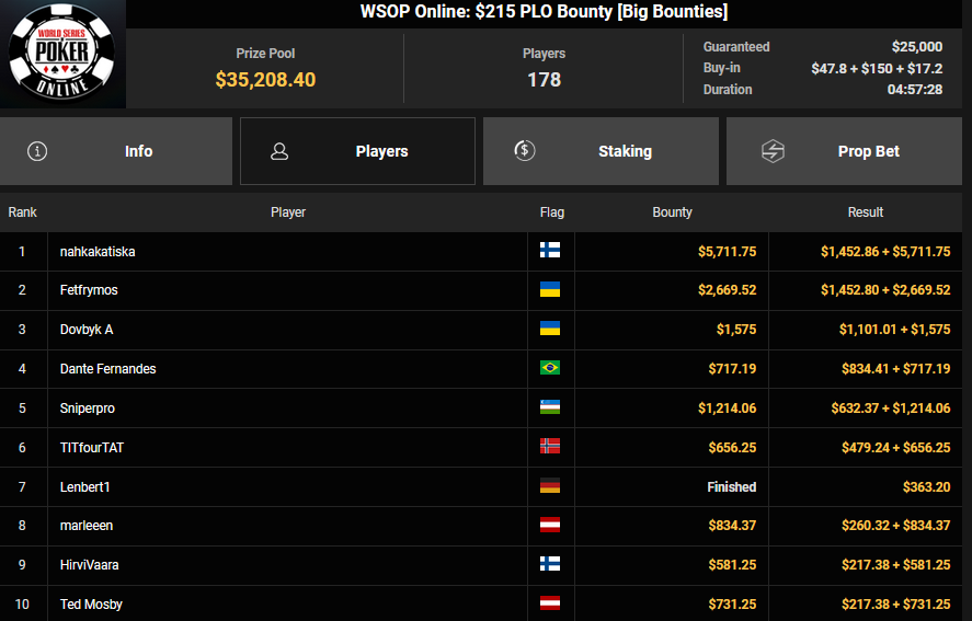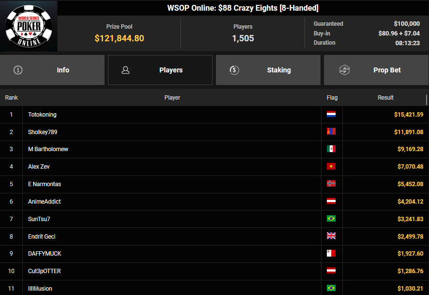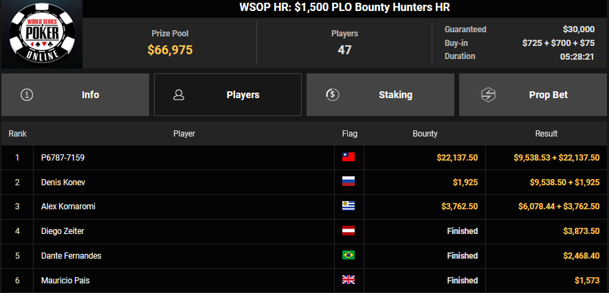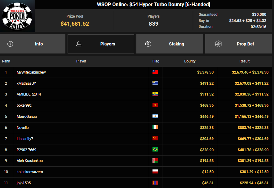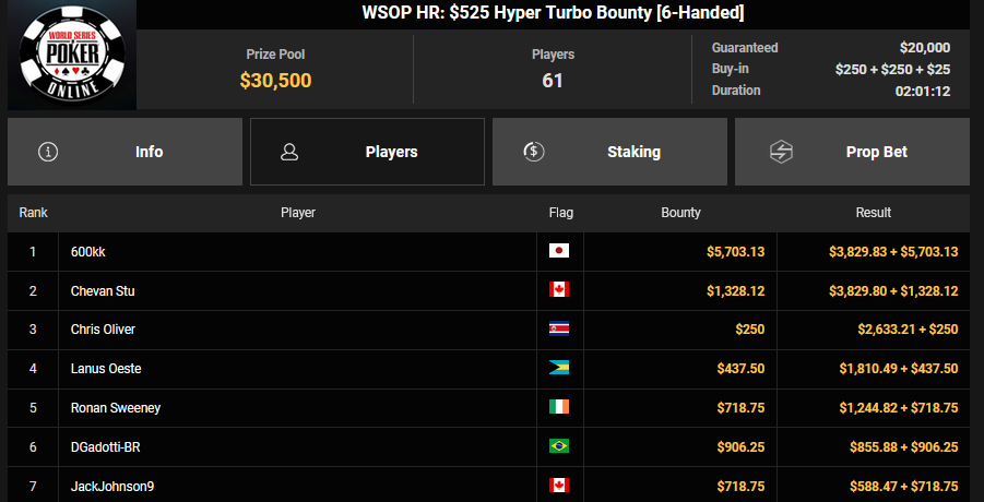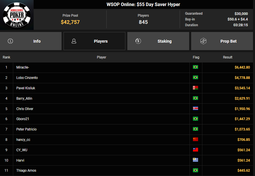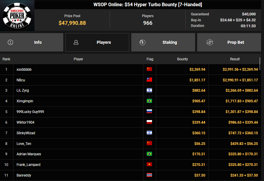 Auch das $525 Superstack Turbo (#18) war mit 3.075 Entries wieder stark frequentiert, $1.537.500 landeten im Pot. PSKVD19 kam als bester Deutscher auf Rang 4 und sicherte sich $47.354 + $5.627. Der Ungar Andras Nemeth unterlag im Heads-up OseaDigamosOsea, der sich das Bracelet für $75.003 + $51.456 + $30k WSOPP Super Pass sicherte.