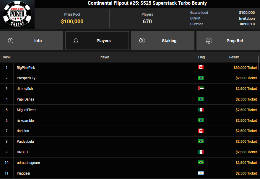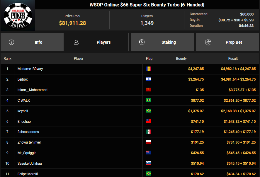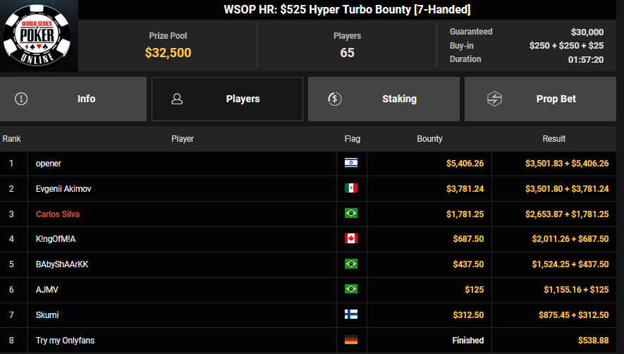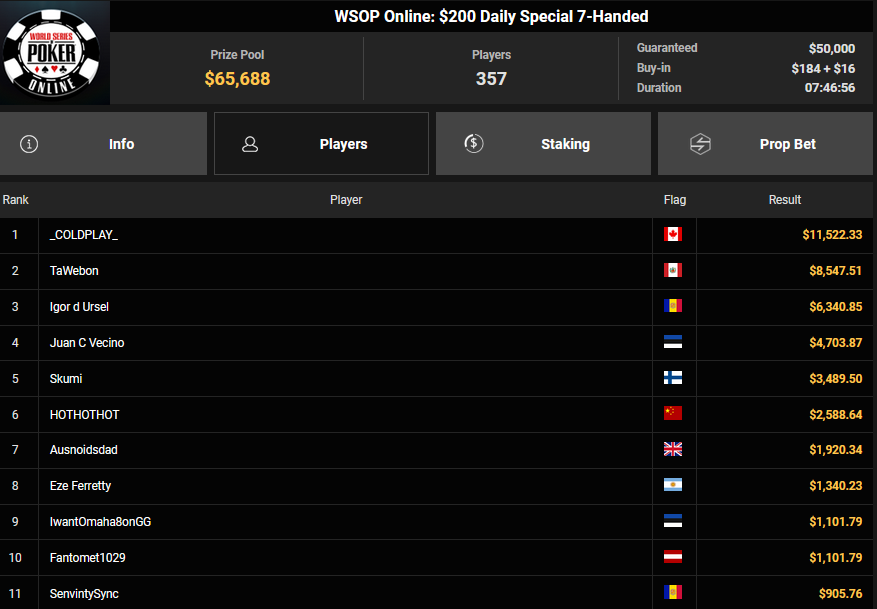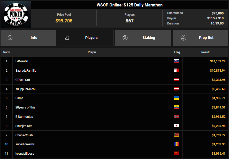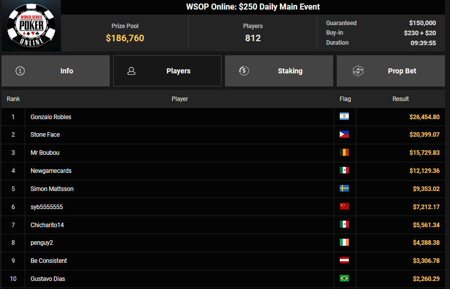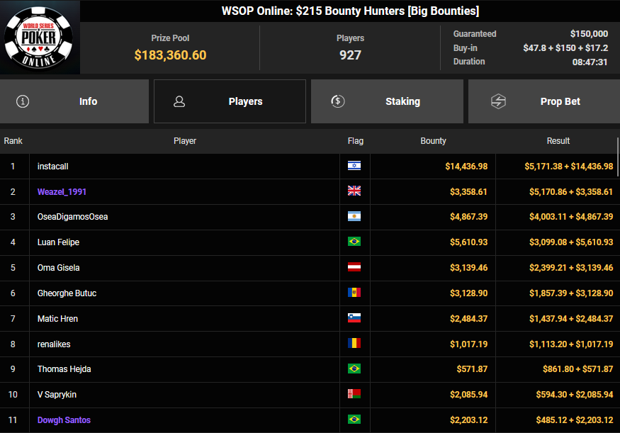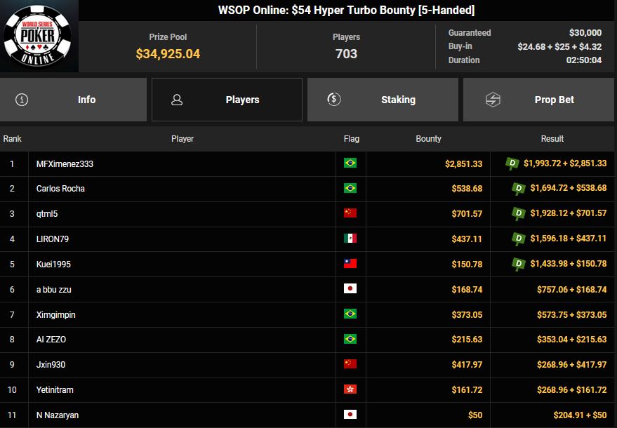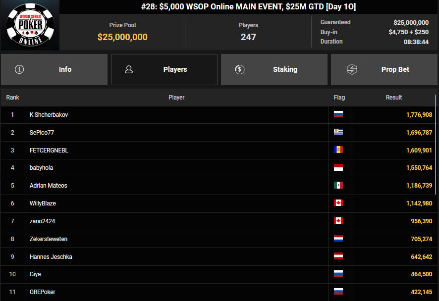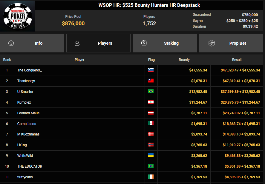 Auch das $525 Superstack Turbo (#18) war mit 3.075 Entries wieder stark frequentiert, $1.537.500 landeten im Pot. PSKVD19 kam als bester Deutscher auf Rang 4 und sicherte sich $47.354 + $5.627. Der Ungar Andras Nemeth unterlag im Heads-up OseaDigamosOsea, der sich das Bracelet für $75.003 + $51.456 + $30k WSOPP Super Pass sicherte.