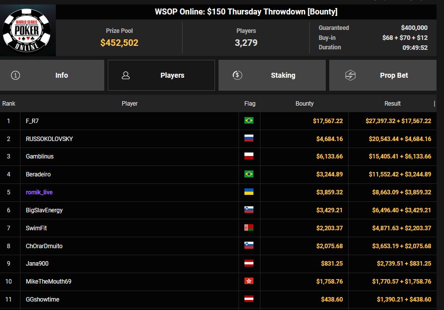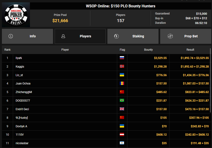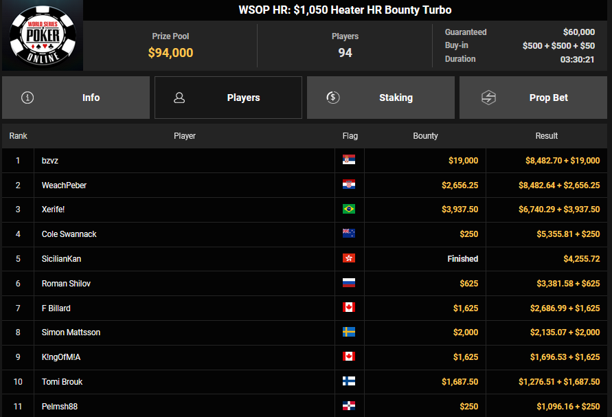 MattVG wurde Runner-up für $4.126 + $2.027 beim $32 Bounty King, RichSpirit belegte Rang 3 beim $77 Double Stack für $6.181.