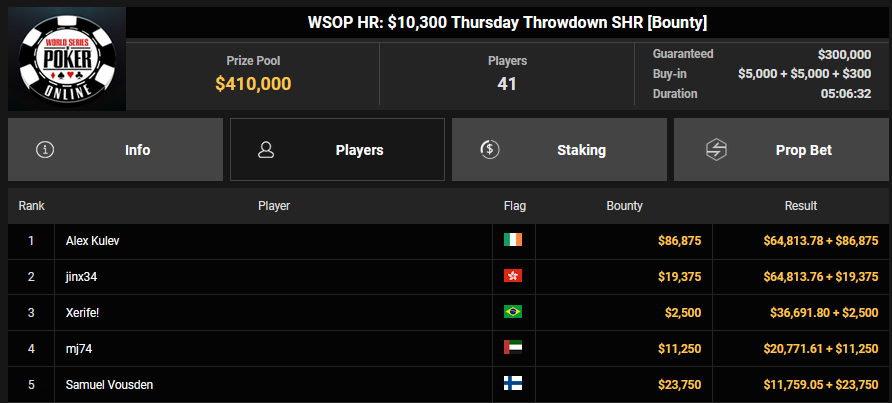 DoubleMonnnstre belegte beim $88 Bounty Classic Rang 3 für $6.307 + $2.467, EagleAye siegte beim $400 Forty Stack Bounty für $4.746 + $10.393. Clickwork konnte den Sieg beim $1.500 Thursday Throwdown HR für $50.088 + $62.879 holen, Leonderi belegte beim $15 Bounty Hunters Freezeout Rang 3 für $2.376 + $862.