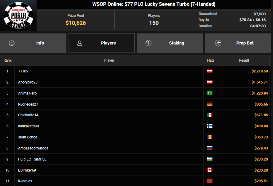1110V siegte beim $77 PLO Luckyy Sevens für $2.218, Angrybird23 wurde Runner-up für $1.606.