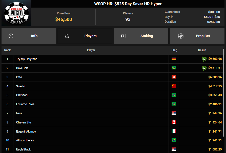 Luke_The_Nuke wurde ebenfalls Runner-up beim $108 Daily Heater für $5.055 + 41.748 und wurde noch Dritter für $2.694 + $2.046 beim $525 Hyper Turbo Bounty. Try my Onlyfans siegte beim $525 Day Saver HR für $9.663.