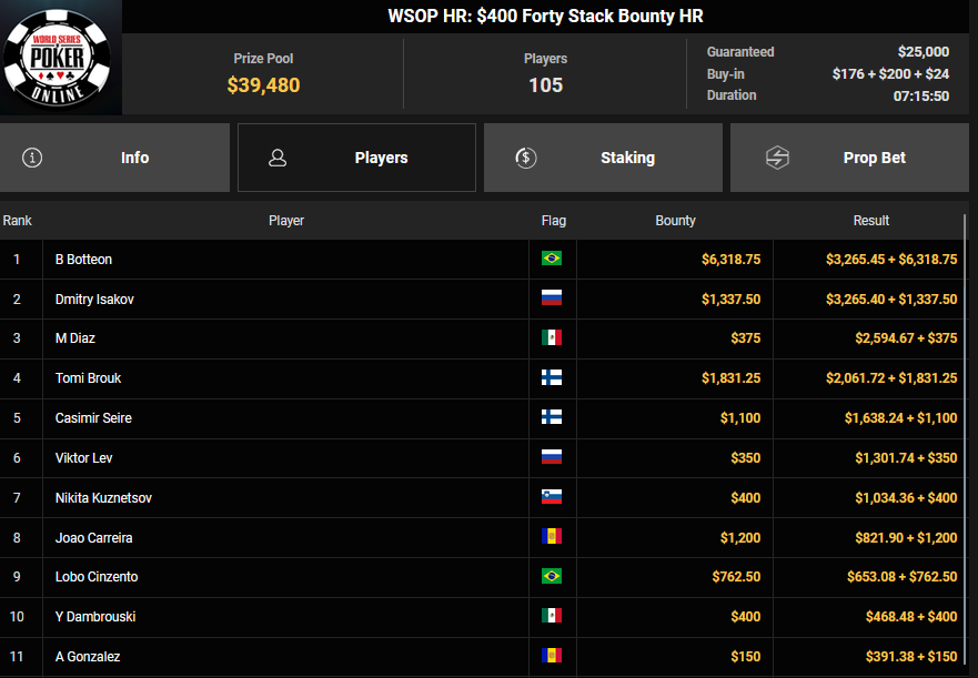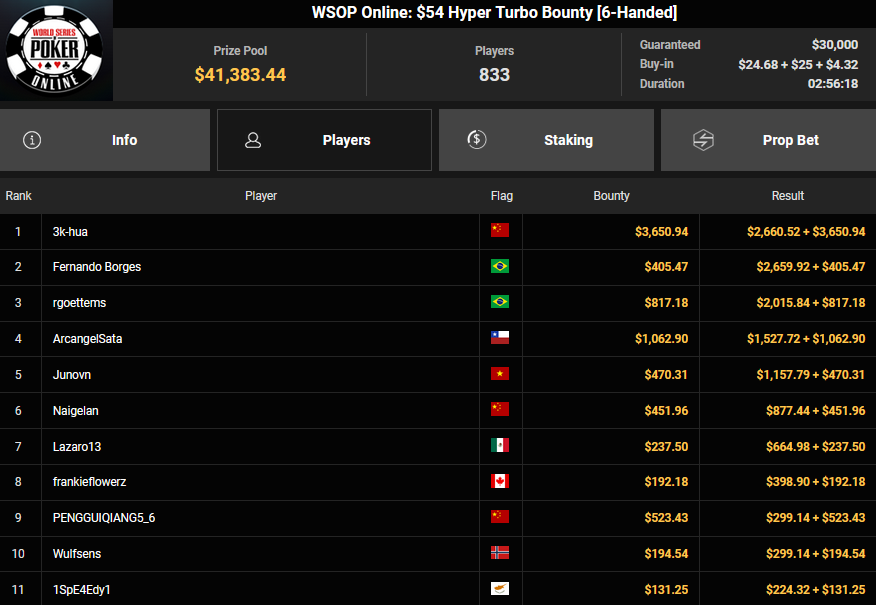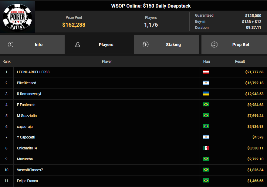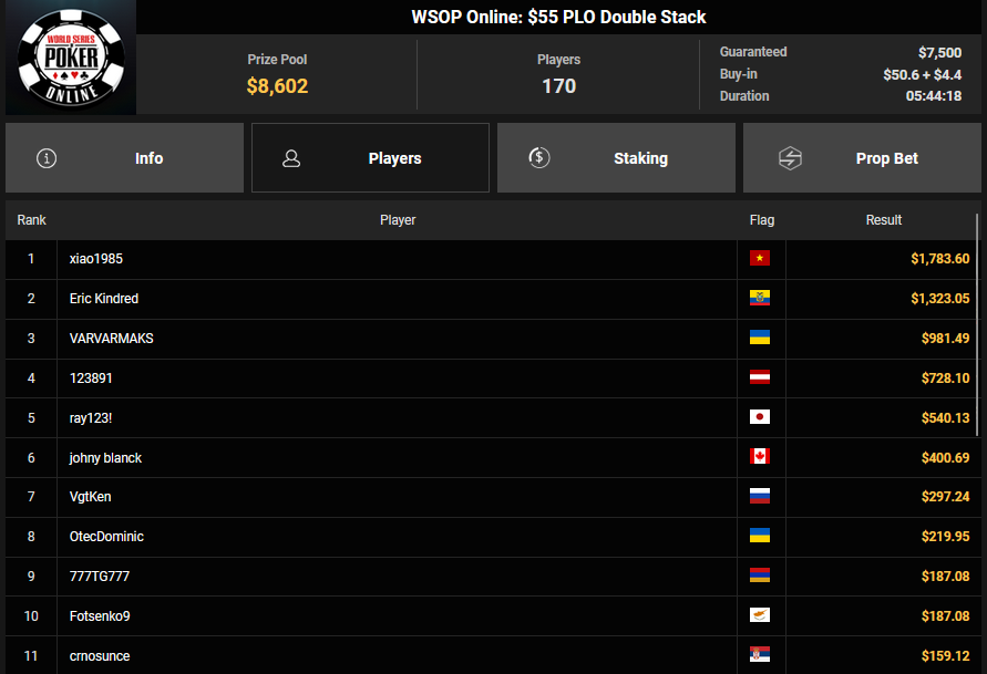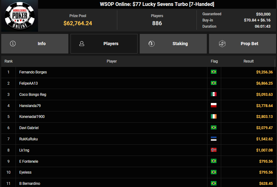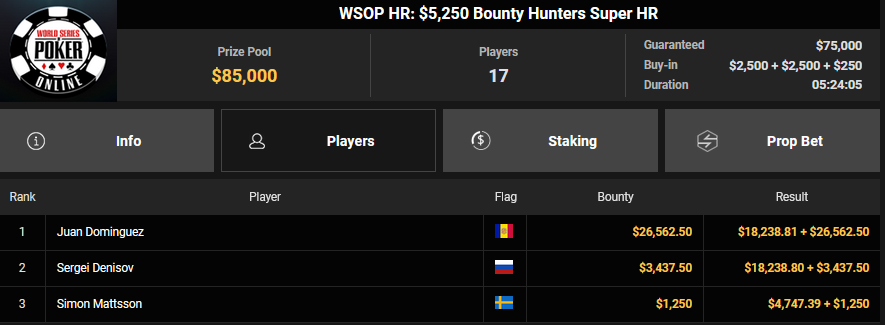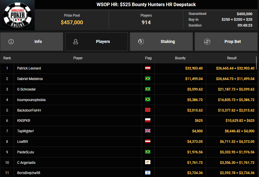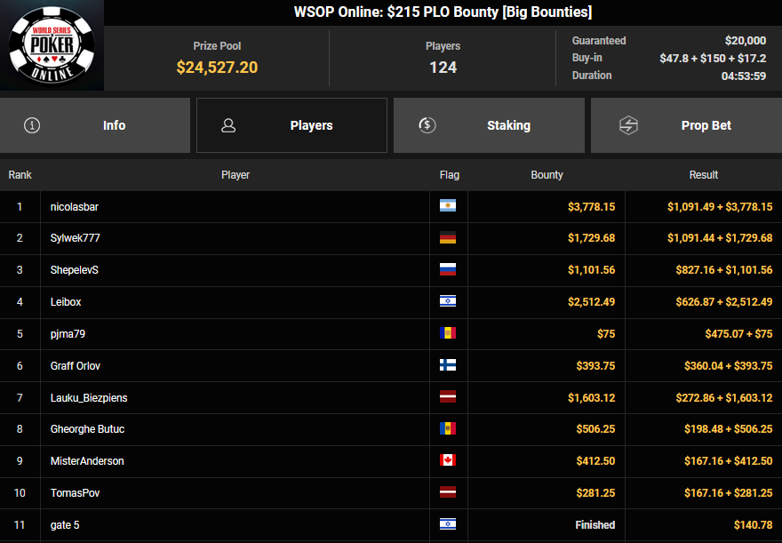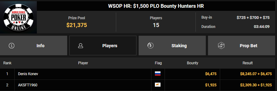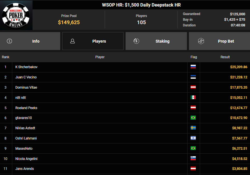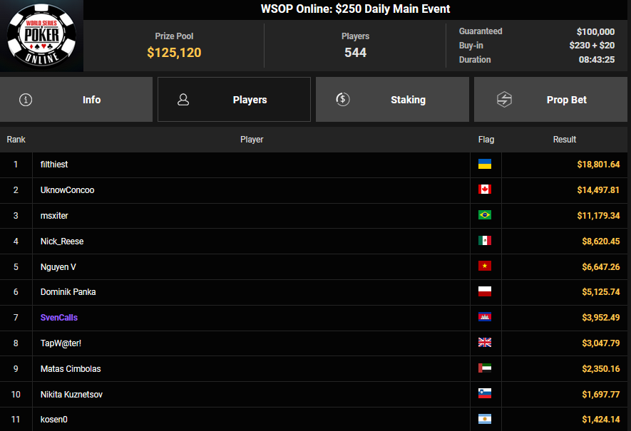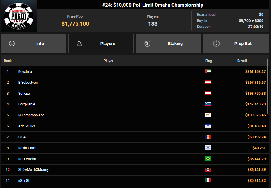 Nur noch sieben der 183 Teilnehmer waren gestern ins Finale gegangen. Fabian-Riebau-Schmithals lag hinter Balint Sebestyen auf Rang 2, als es ins Finale ging, alle hatten $60.192 bereits sicher. Für Fabian sollte auf Rang 3 Feierabend sein, er tröstete sich mit $198.750. Auch der Chipleader brachte seine Führung aber nicht ins Ziel, im Heads-up unterlag er Kolialma, der sich über $361.153 + $30k WSOPP Super Pass freuen konnte, Sebestyen kassierte $267.916 für Rang 2.