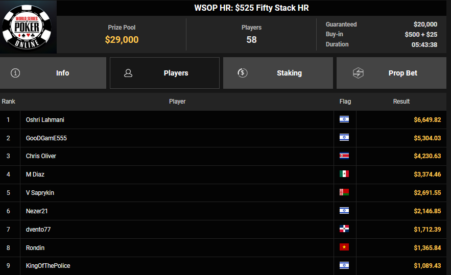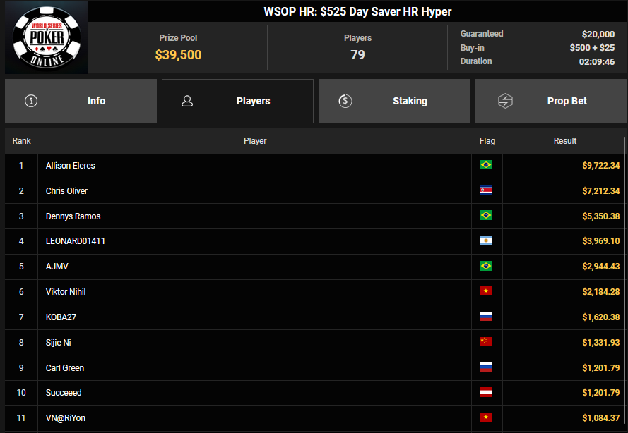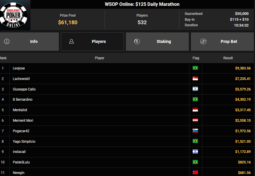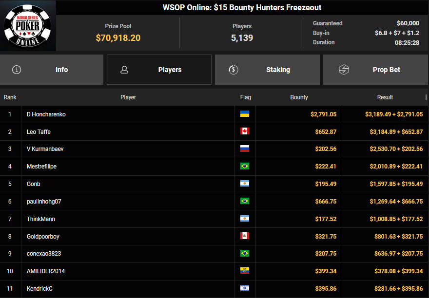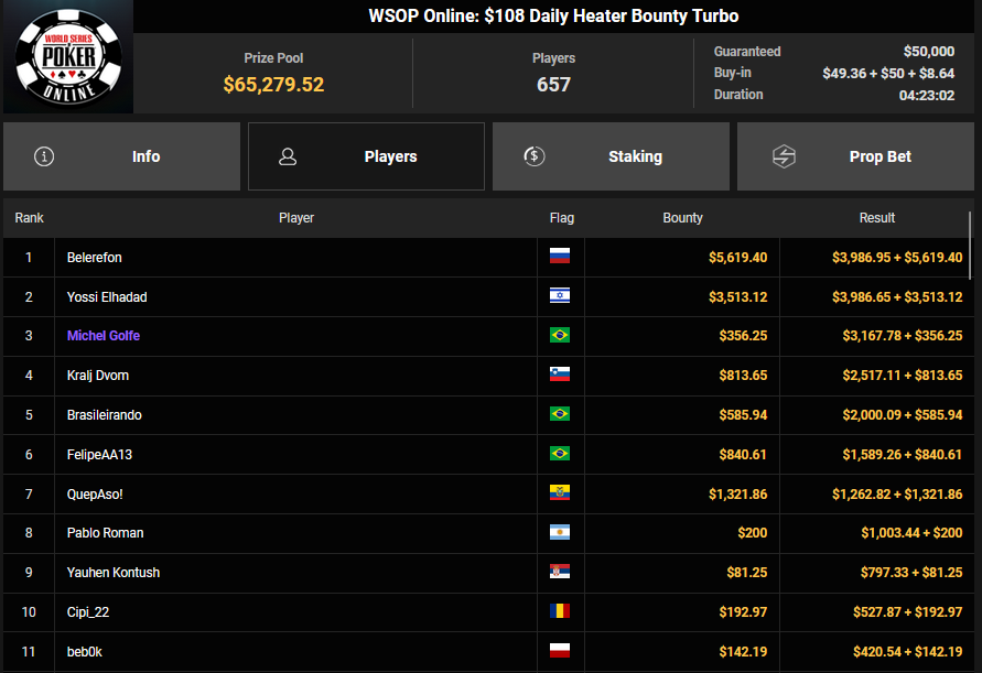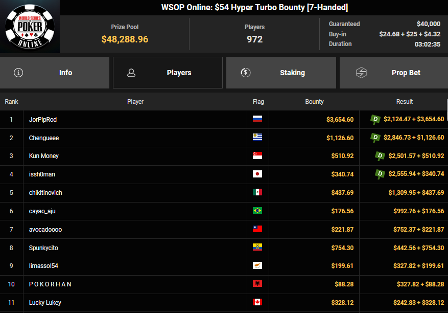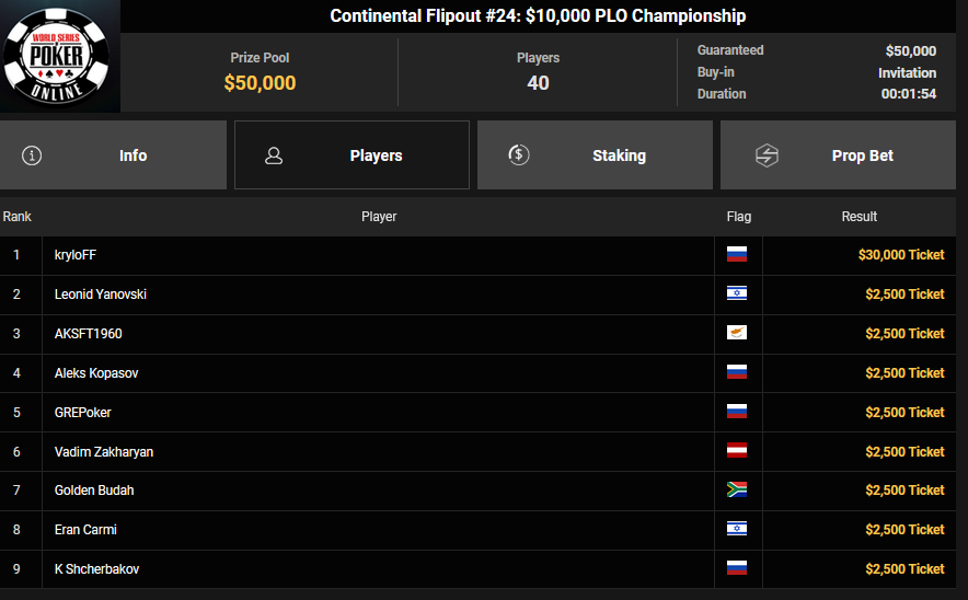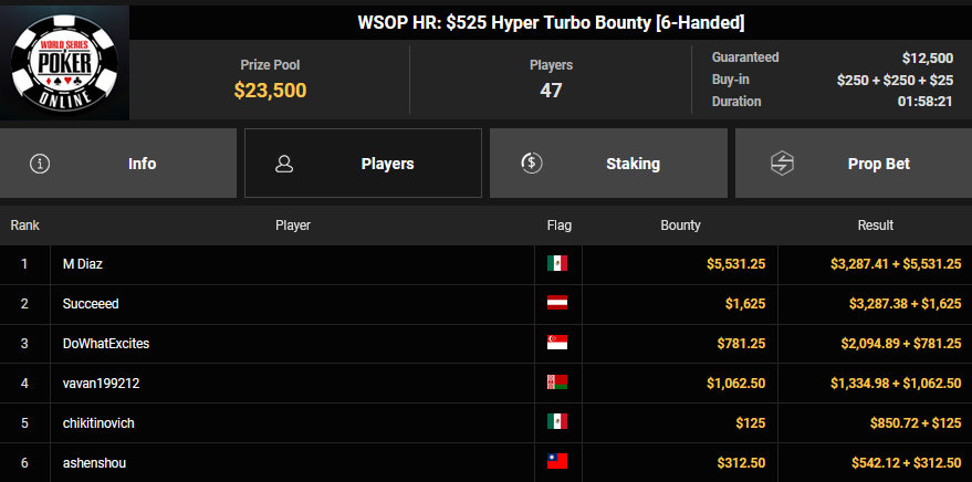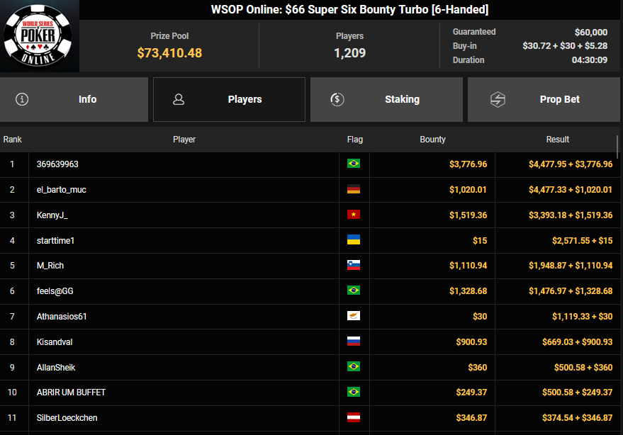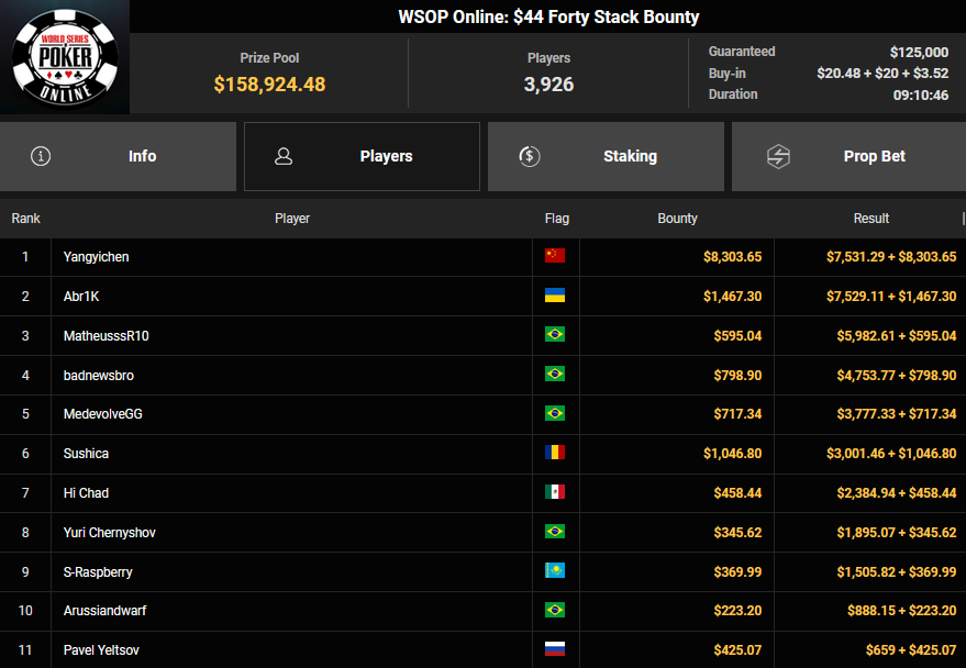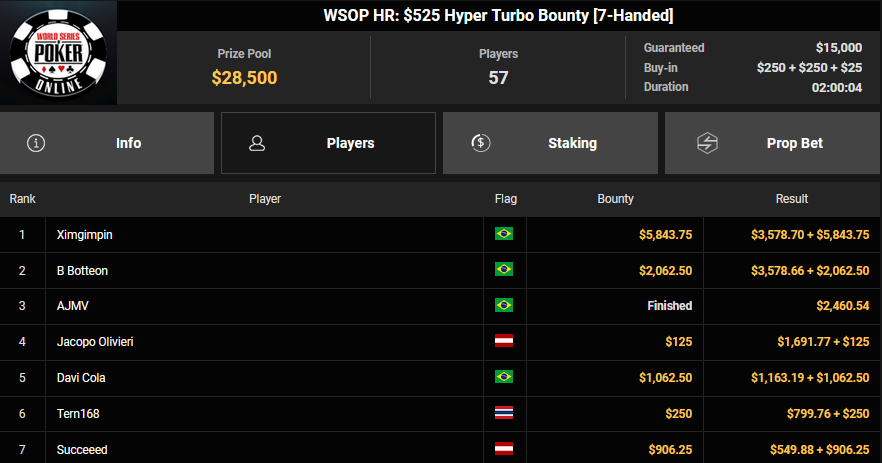 Nur noch sieben der 183 Teilnehmer waren gestern ins Finale gegangen. Fabian-Riebau-Schmithals lag hinter Balint Sebestyen auf Rang 2, als es ins Finale ging, alle hatten $60.192 bereits sicher. Für Fabian sollte auf Rang 3 Feierabend sein, er tröstete sich mit $198.750. Auch der Chipleader brachte seine Führung aber nicht ins Ziel, im Heads-up unterlag er Kolialma, der sich über $361.153 + $30k WSOPP Super Pass freuen konnte, Sebestyen kassierte $267.916 für Rang 2.