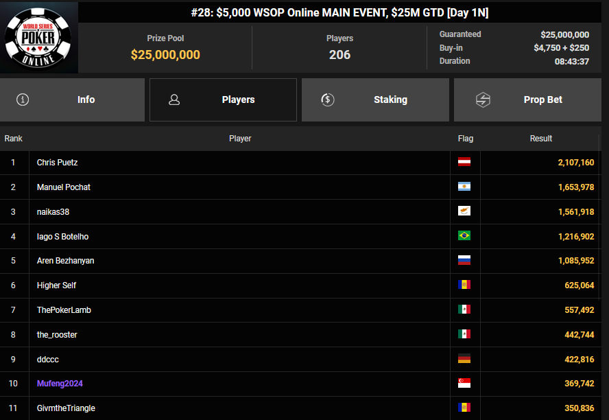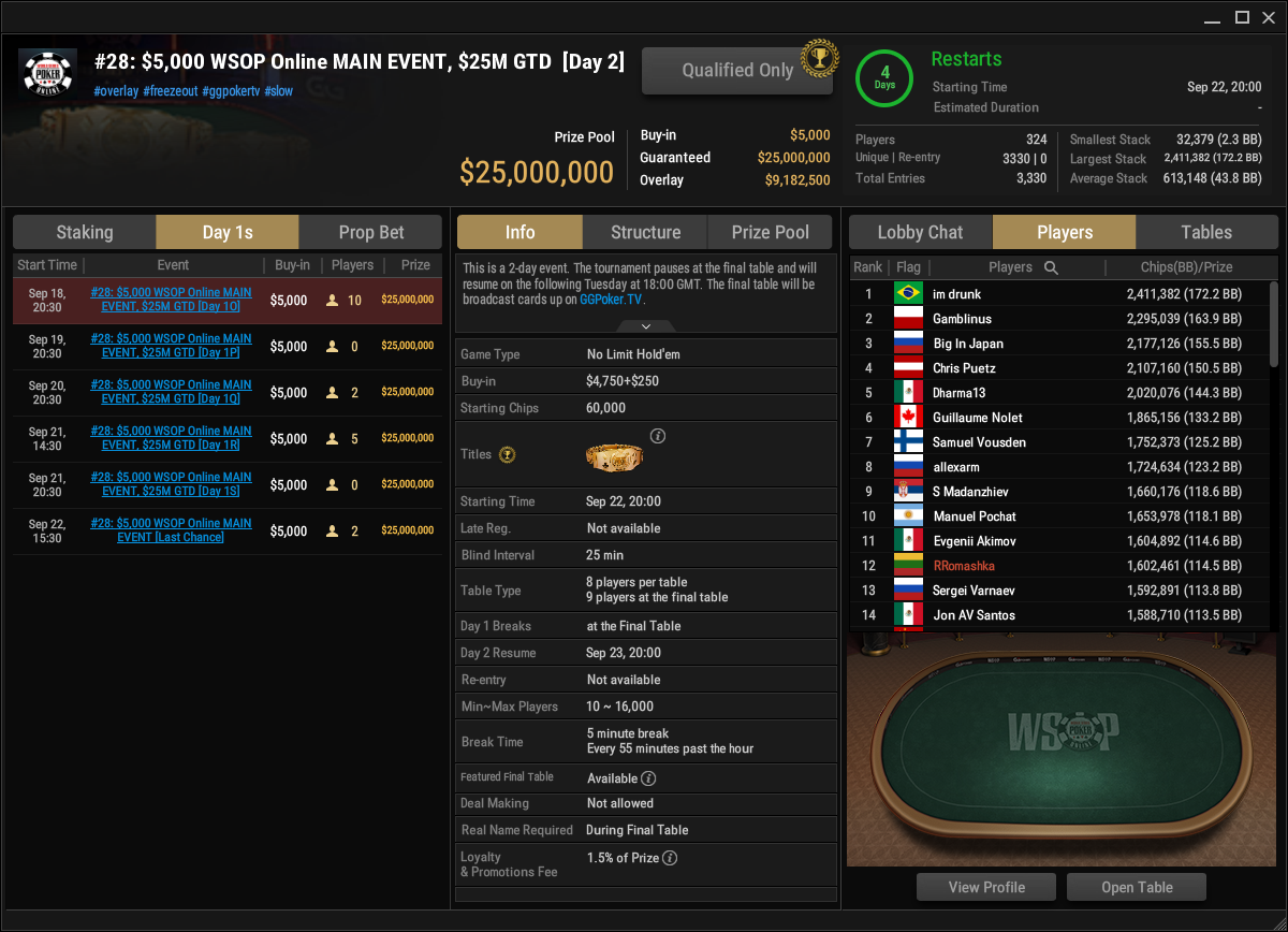 Beim $5.000 Main Event sind es bereits 3.330 Entries, $9,1 Mio. fehlen aber noch zu den garantierten $25.000.000. Gestern wurde Tag 1N gespielt und hier konnte sich Christopher Pütz mit 2.107.000 Chips den Tagessieg bei 206 Teilnehmern sichern, in der Gesamtwertung liegt er als bester Deutscher nun auf Rang 4, auch Titelverteidiger Moritz Dietrich ist schon für Tag 2 qualifiziert. Sechs Flights werden bis zum 22. September noch angeboten, es gibt auch zahlreiche Satellites.