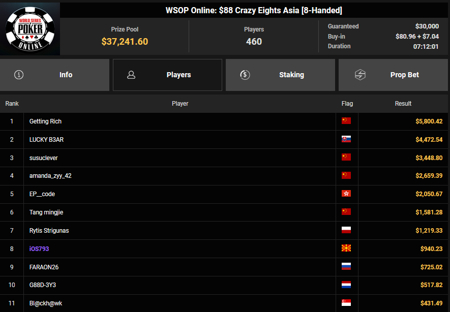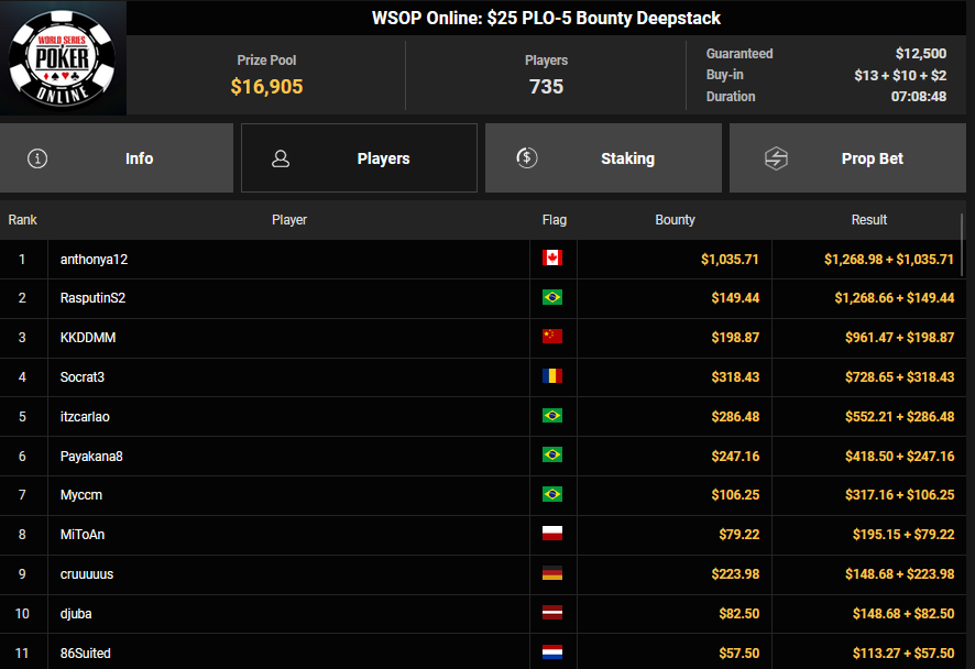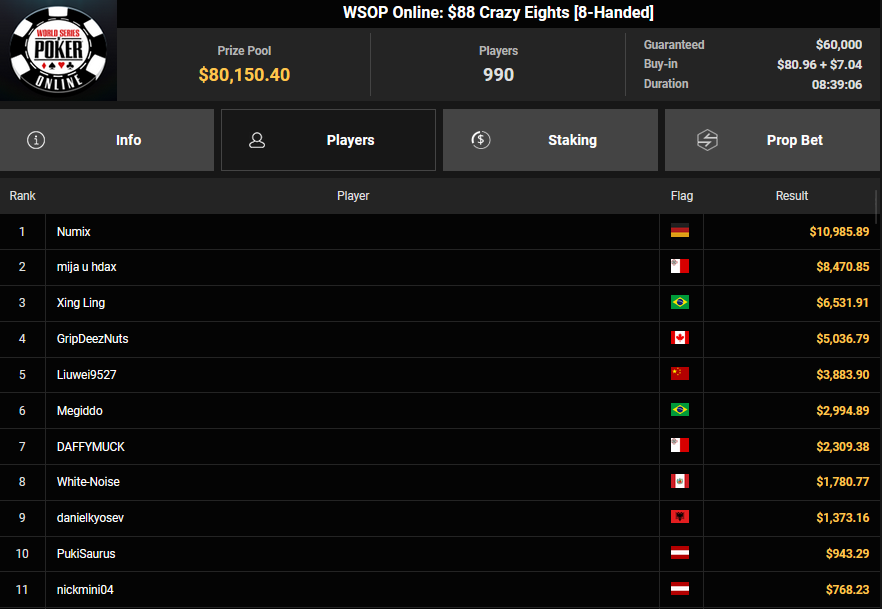 Numix holte den Sieg beim $88 Crazy Eights und wurde mit $10.985 belohnt. Leonard Maue kassierte $19.313 für Rang 3 beim $3.000 Prime Time, der Sieg für $34.200 nach einem Deal ging an Enrico Camosci. Sylwek777 belegte Rang 2 beim $215 PLO Bounty für $1.091 + $1.729, LEONHARDEULER83 konnte sich das $150 Daily Deepstack für $21.777 sichern.