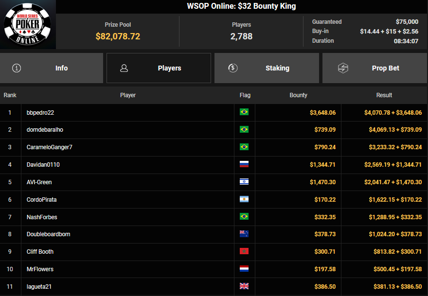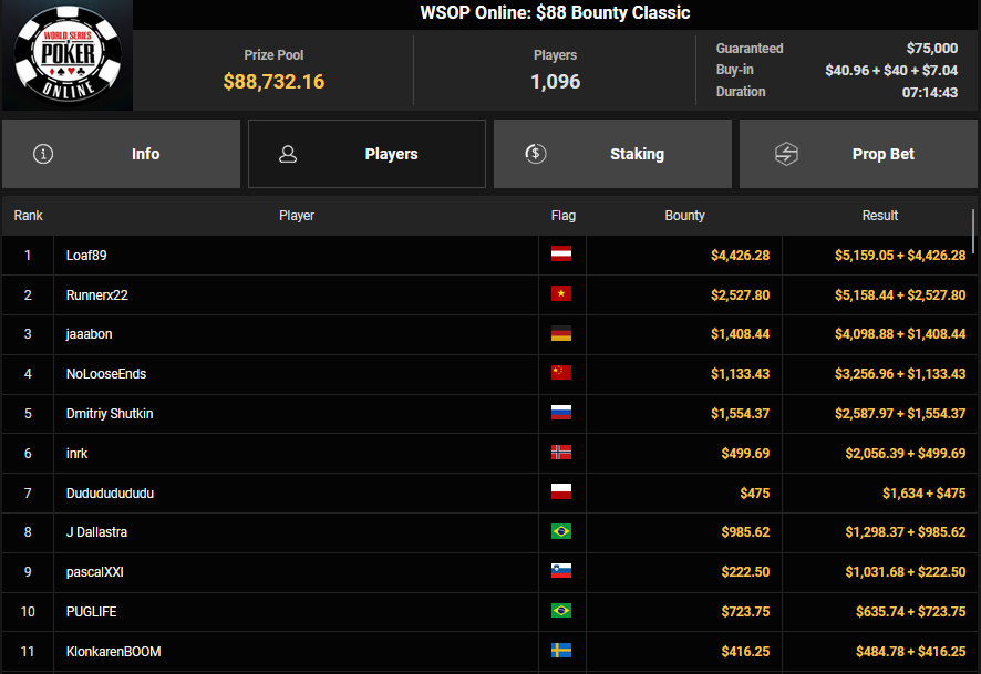 Bei den Side Event lief es wie immer gut, auch einige Siege wurden verzeichnet. Knudi79 holte das $15 Bounty Warm-up für $3.535 + $3.806, Loaf89 setzte sich beim $88 Bounty Classic durch und kassierte $5.159 + $4.426, jaaabon konnte Rang 3 für $4.098 + $1.408 erobern.