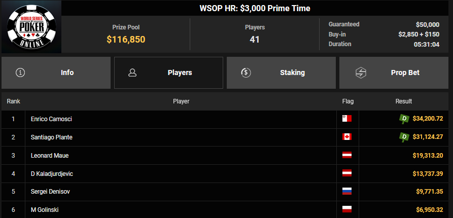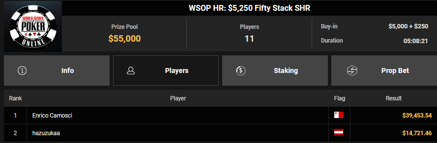 Es waren nur elf Runner beim $5.250 Fifty Stack, auch hier ging der Sieg an Enrico Camosci ($39.453), hazuzukaa belegte Rang 2 für $14.721.