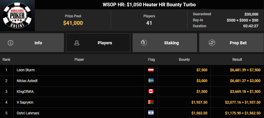 Wizzydererste setzte sich beim $150 PLO Bounty durch und kassierte $1.559 + $3.163, während sich Leon Sturm gegen Niklas Astedt behauptete und den Sieg für $6.481 + 47.900 beim $1.050 Heater einfuhr. el_barto_muc wurde beim $66 Super Six Bounty Runneer-up für $4.477 + $1.020, auch für Succeeed gab es dieses Mal nur Rang 2 beim $525 Hyper Turbo ($3.287 + $1.625).