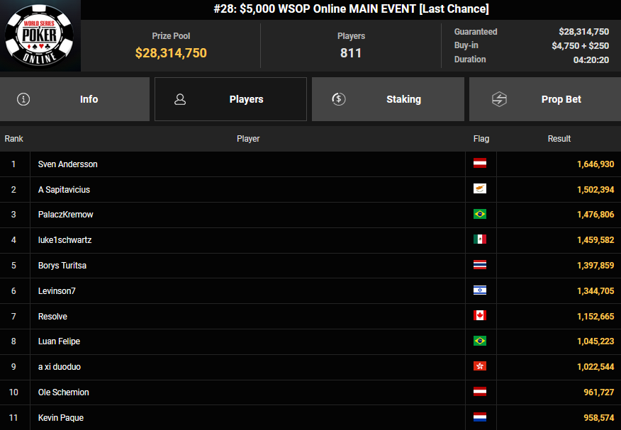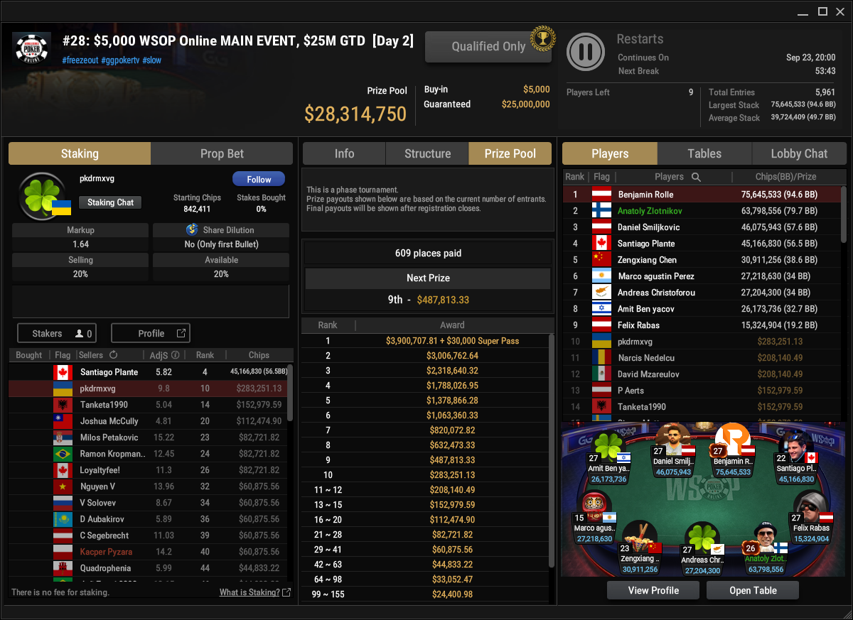 Als der Final Table erreicht war, hatte sich Benjamin Rolle mit 94 BB den Chiplead gesichert, Daniel Smiljkovic liegt mit 57 BBs auf Rang 3. Felix Rabas ist mit nur 19 BB der Shortstack, hat aber auch schon $487.813 als Preisgeld sicher. Der Sieger kassiert $3.900.707 + $30k WSOPP Super Pass.