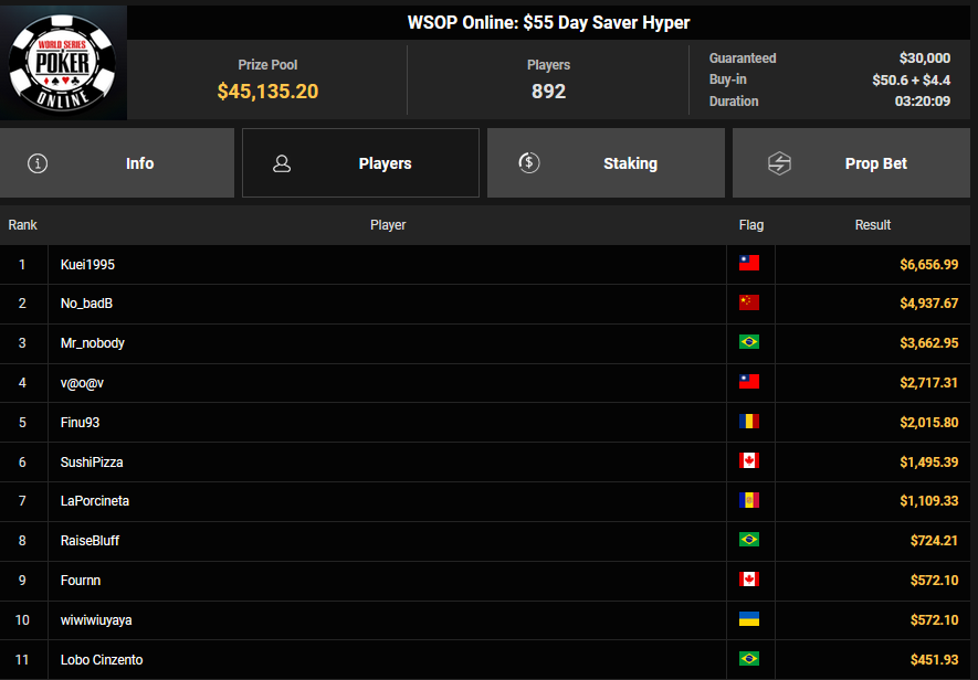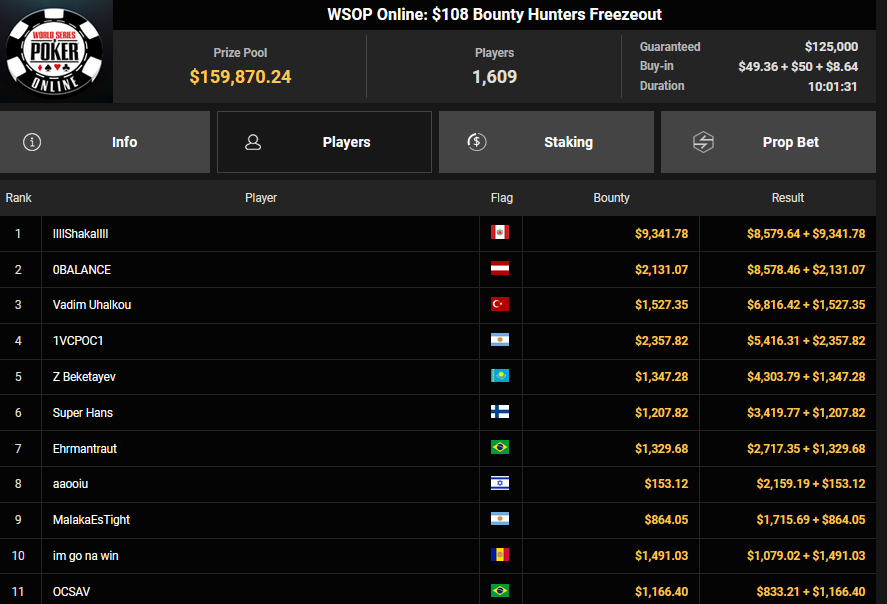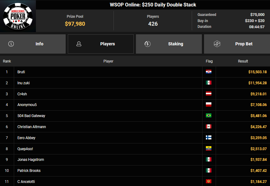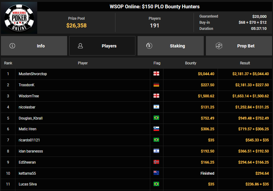 Mit noch zehn Spielern war es beim $1.050 Mystery Bounty PLO (#27) ins Finale gegangen. Thomas Mühlöcker und Vanessa2001 waren noch mit dabei, allerdings musste Vanessa2001 dann gleich mit Rang 9 für $6.301 +$54.120 den Tisch verlassen. Für Thomas Mühlöcker ging es aufs Podest, über Rang 3 ($41.413 + $17.300) kam er dann aber auch nicht hinaus. Michal Danka war als Chipleader ins Finale gestartet und ging auch als Sieger mit $75.254 + $37.520 +30k WSOPP Super Pass vom Tisch.
