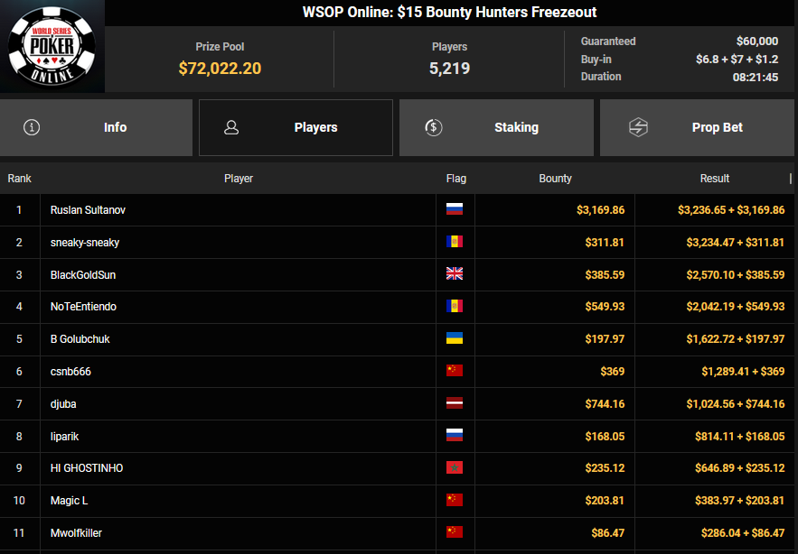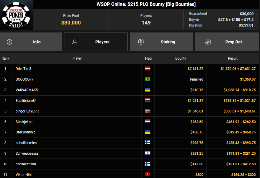 DriveTim3 sicherte sich den Sieg beim $215 PLO Bounty für $1.370 + $7.631, 0BALANCE wurde beim $108 Bounty Hunters Freezeout Runner-up für $8.578 + $2.131. Auch TroodonK verpasste den Sieg beim $150 PLO Bounty für $2.181 + $227, Caracara konnte sich dafür den Sieg beim $108 Daily Heater für $4.916 + $8.307 sichern.